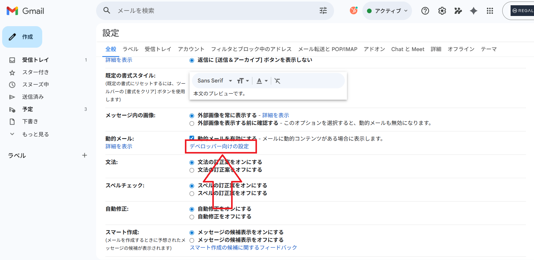 まず、ご自身のGmailでAMPメールを表示できるように「デベロッパー設定」を行います。