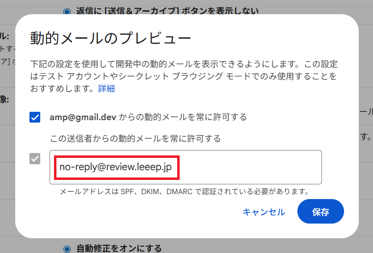 「amp@gmail.dev からの動的メールを常に許可する」 にチェックを入れる。