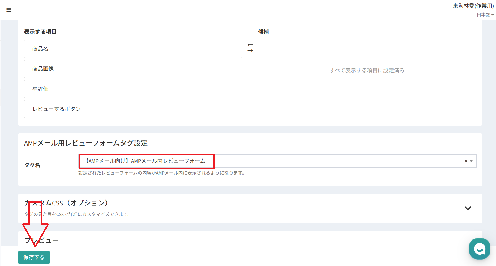 フォームをクリックすると選択肢がプルダウンで表示されるので、その中からAMPメール内に表示させたいレビューフォームタグを選び、保存してください。