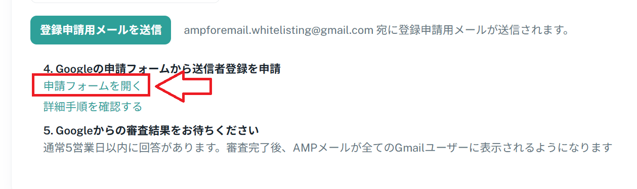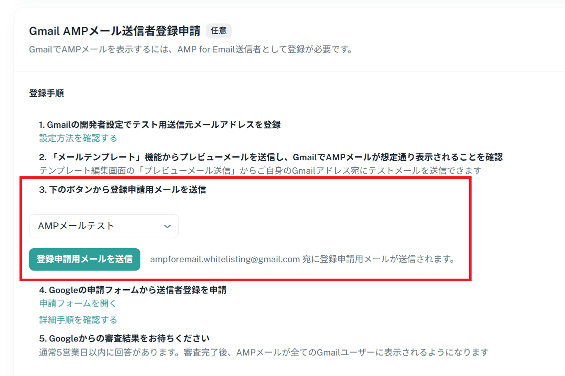 「送信元設定」のタブを開き、「Gmail AMPメール送信者登録申請」のセクションに移動します。