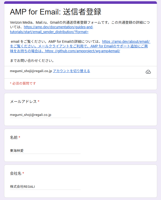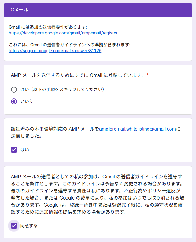 AMP メールを送信するためにすでに Gmail に登録しています。 | 「いいえ」にチェック |