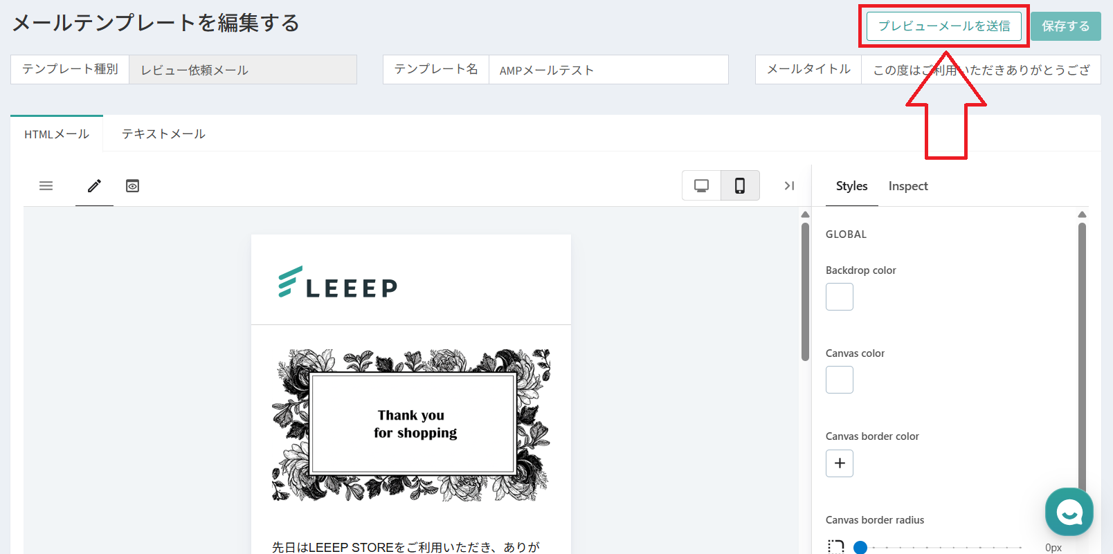 LEEEPの「メールテンプレート」編集画面にある [プレビューメール送信] から、ご自身のGmailアドレス宛にテストメールを送信します。