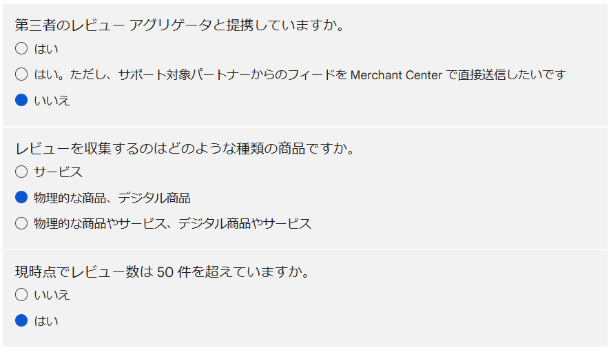 「第三者のレビュー アグリゲータと提携していますか?」 → 「いいえ」 を選択