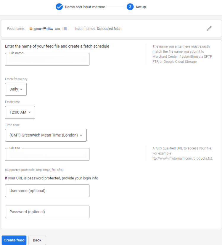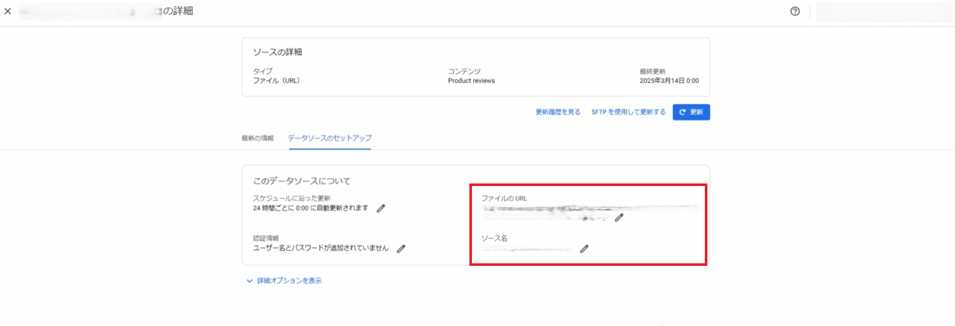 ファイル名とフィードファイルURLをコピーし、Merchant Center の「ソース名(ファイル名)」と「ファイルのURL」に貼り付け