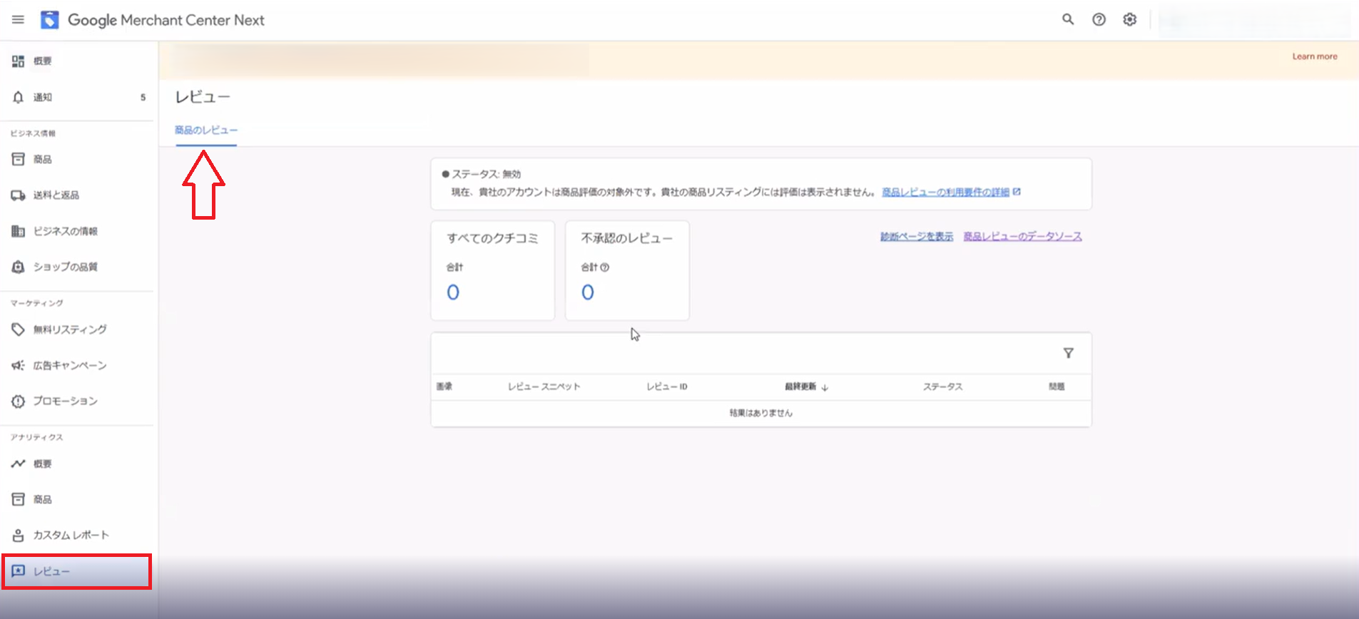 Merchant Centerの[商品のレビュー]タブが利用可能になっているかご確認ください。
