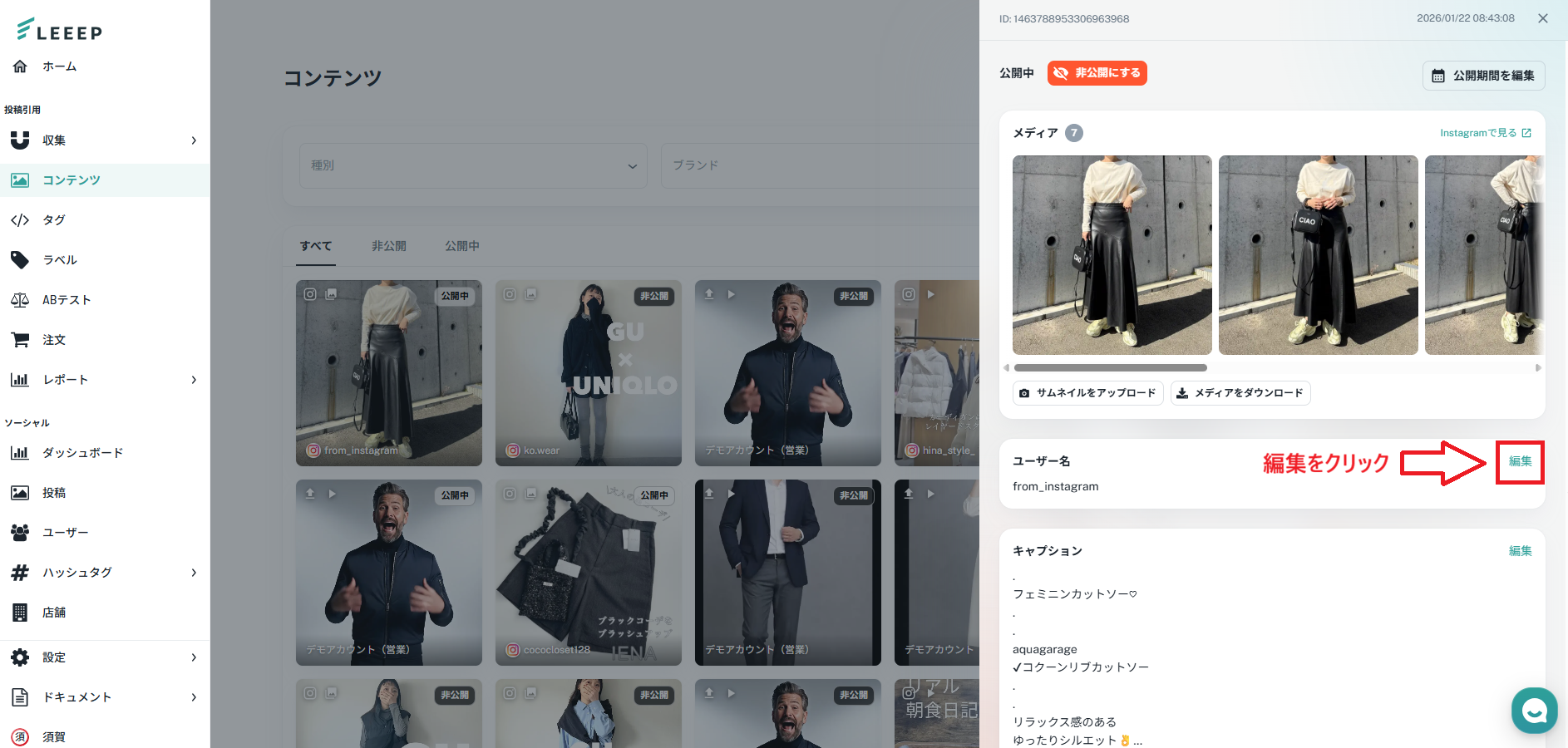 管理画面「コンテンツ」から該当する投稿をクリックして、ユーザ名を変更できるようになりました。