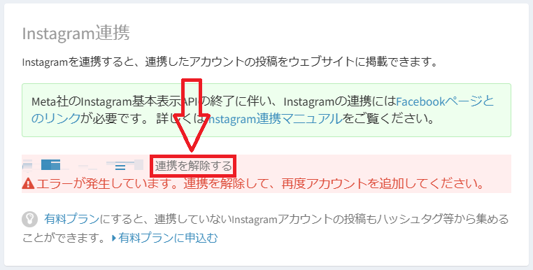 「Instagram連携」の設定画面で、『エラーが発生しています。連携を解除して、再度アカウントを追加してください。』というメッセージが表示される場合、Instagramアカウントとの再連携が必要です。
