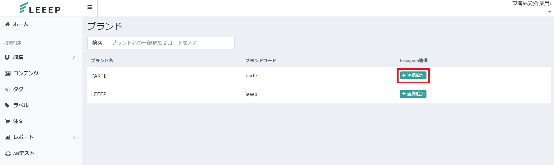 管理画面「設定」>「ブランド」のページを開き、「連携追加」のボタンからInstagram連携を進めてください。