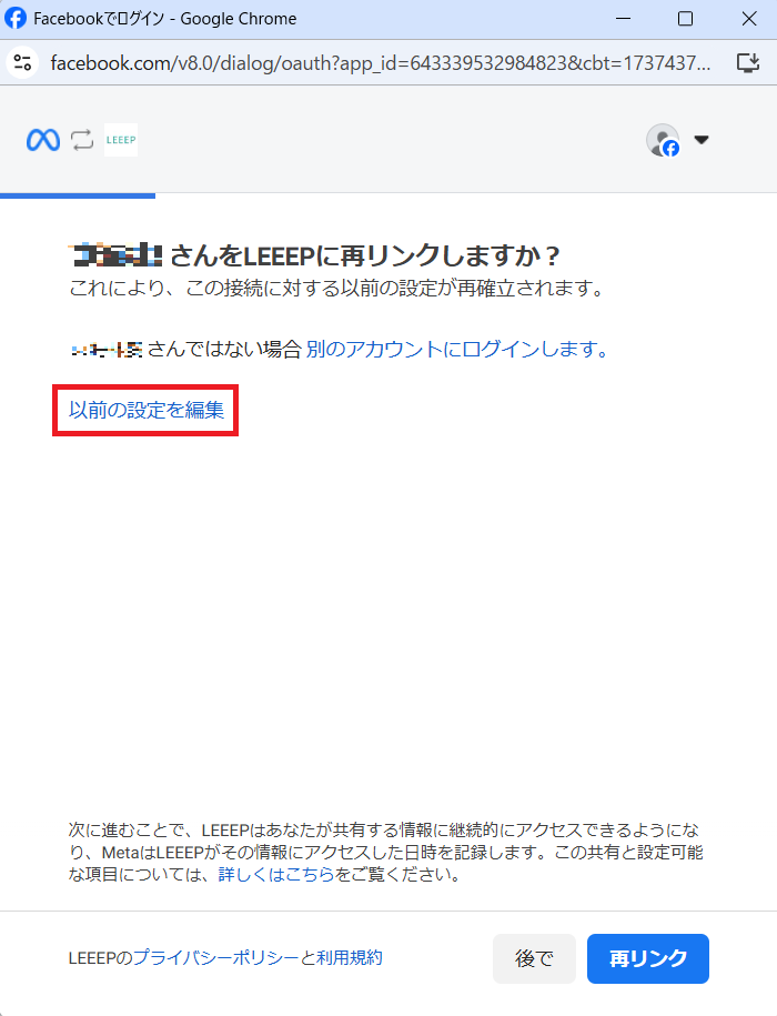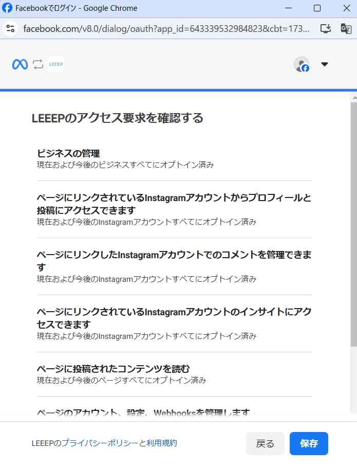 LEEEPへのInstagram連携を行う人が、Facebookページの管理者である