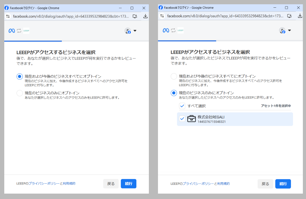 「現在および今後のビジネスすべてにオプトイン」を選択するか、「現在のビジネスのみにオプトイン」で連携したいビジネスを選択した上で、「続行」を押下してください。
