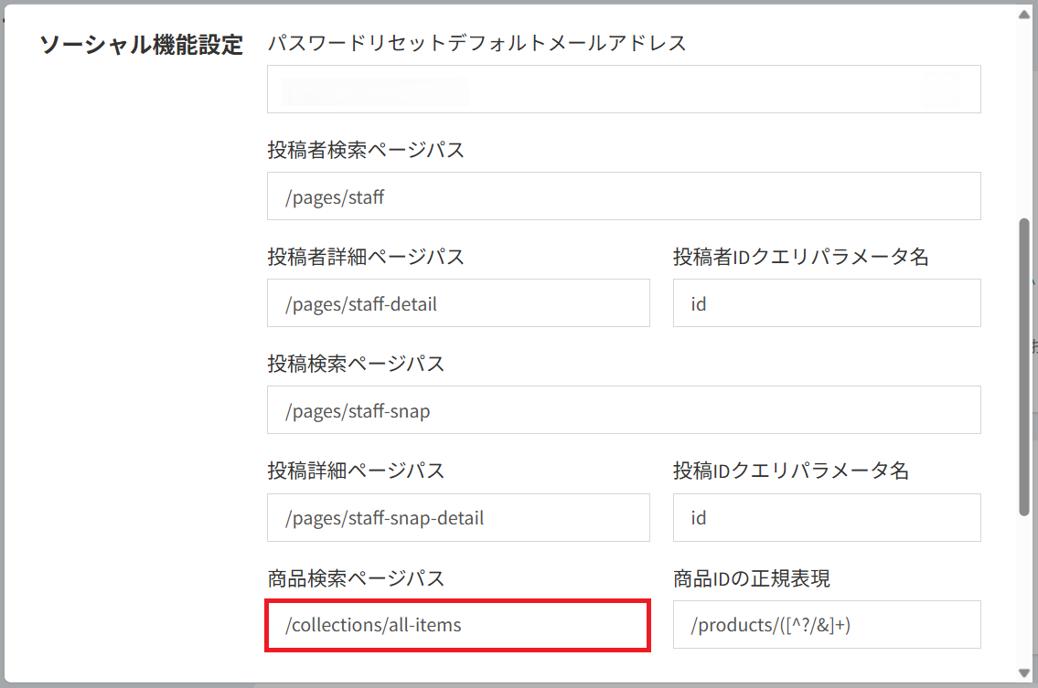 LEEEP管理画面の [設定] > [アカウント情報] > [ウェブサイト] の編集画面*¹にて、ソーシャル機能設定の「商品検索ページパス」*²をご設定いただく必要があります。