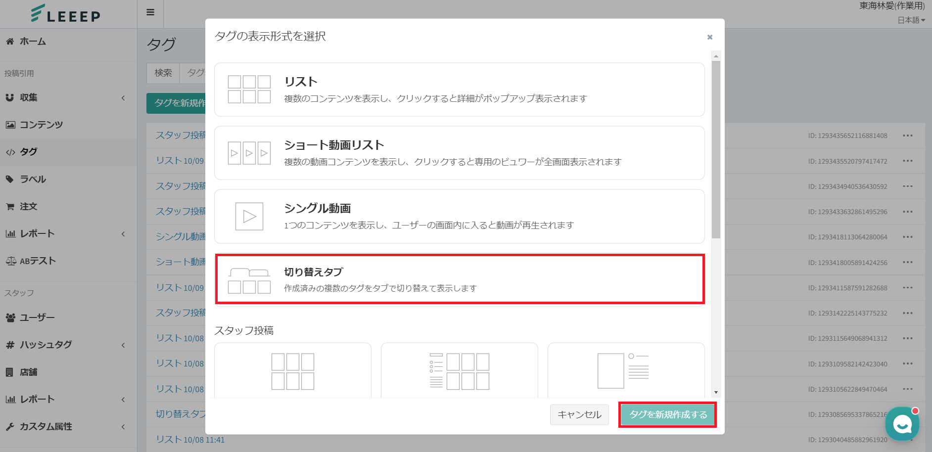 作成済みのタグを複数選択し、タブで切り替えることが可能です。