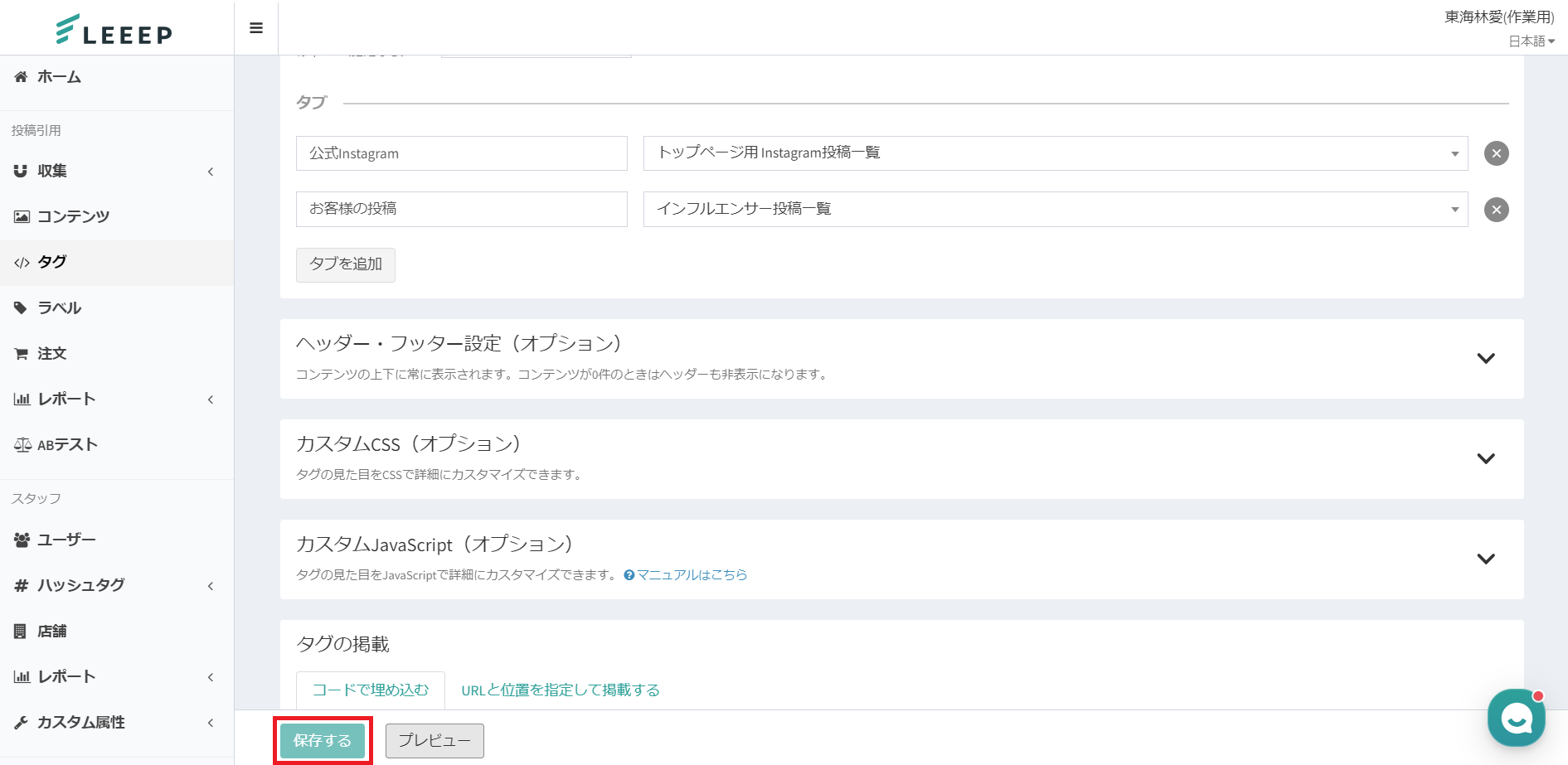 ④作成したタグの内容に問題がなければ「保存する」をクリックして設定を完了してください。