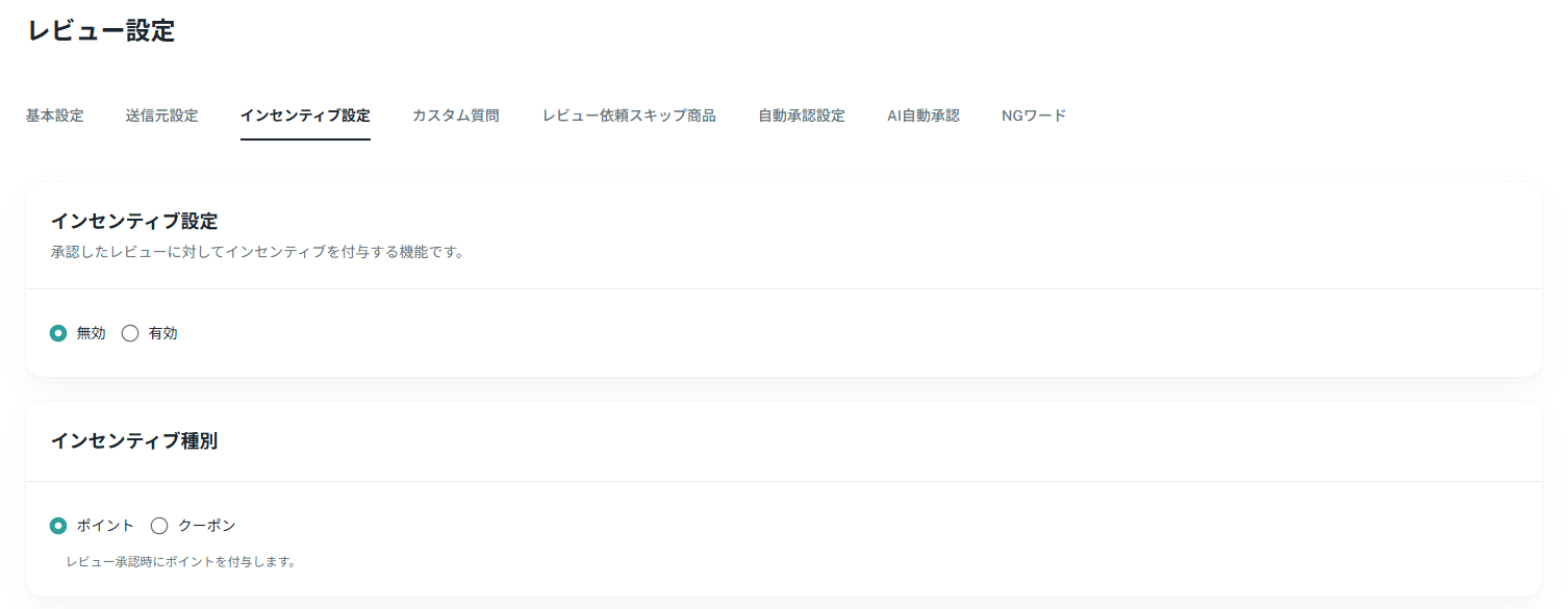 管理画面の「レビュー設定」にある「インセンティブ設定」タブから、本機能の有効/無効、各種ポイント数、および付与条件を設定できます。