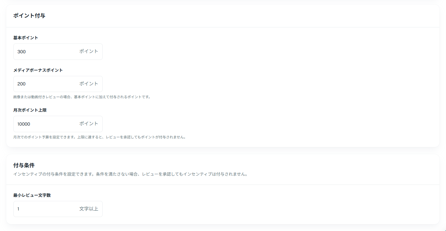 この機能を利用すると、以下の設定に基づいてレビュー投稿者にポイントを付与できます。